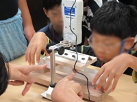 軽くて強いペーパーブリッジを作るために、まずは板の曲げの強度や変形抵抗について、小学生は模型を使った実験で、また、中学生は電卓を使って測定しました。次に、その知識をもとに、薄い紙を使って強く変形しにくいブリッジの製作を行い、その上に乾電池を置いて強度を確認しました。